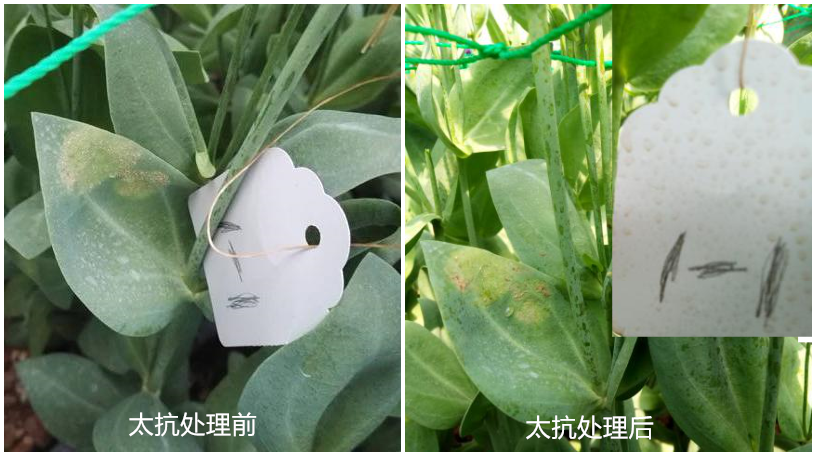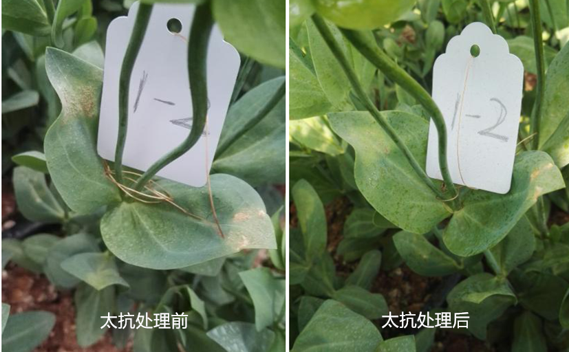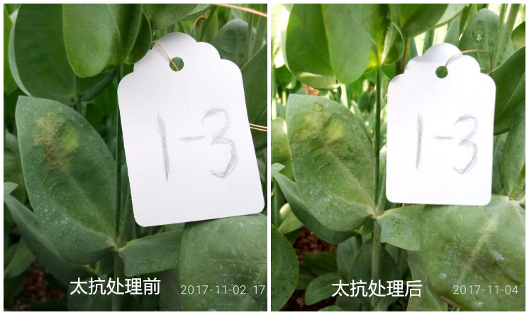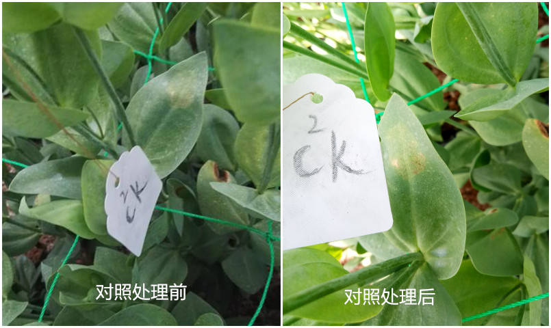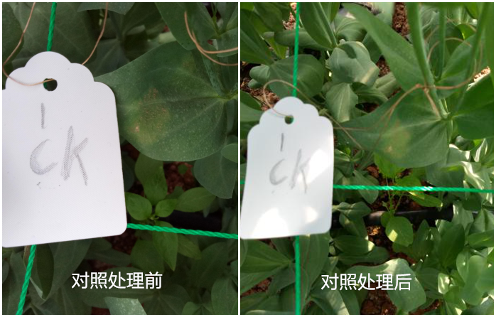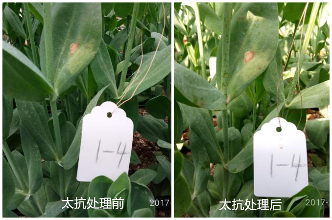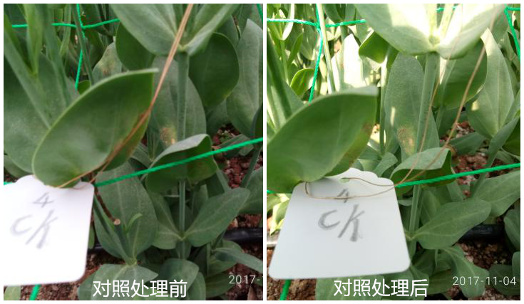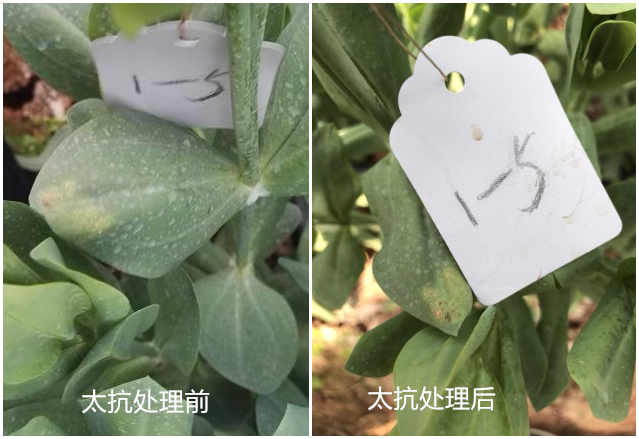 試驗(yàn)結(jié)果:太抗幾?。久快`能有效防治洋桔梗灰霉病,使灰色霉層變干脫落。對(duì)照組仍有部分病斑沒有得到有效控制。
